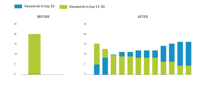 This SEO case study explores how we were able to achieve top 10 rankings for almost 20 key terms relevant to the client line of business. We employed white-label SEO solutions in order to accomplish this goal and saw a marked increase in website traffic that aided in a higher volume of conversions.
